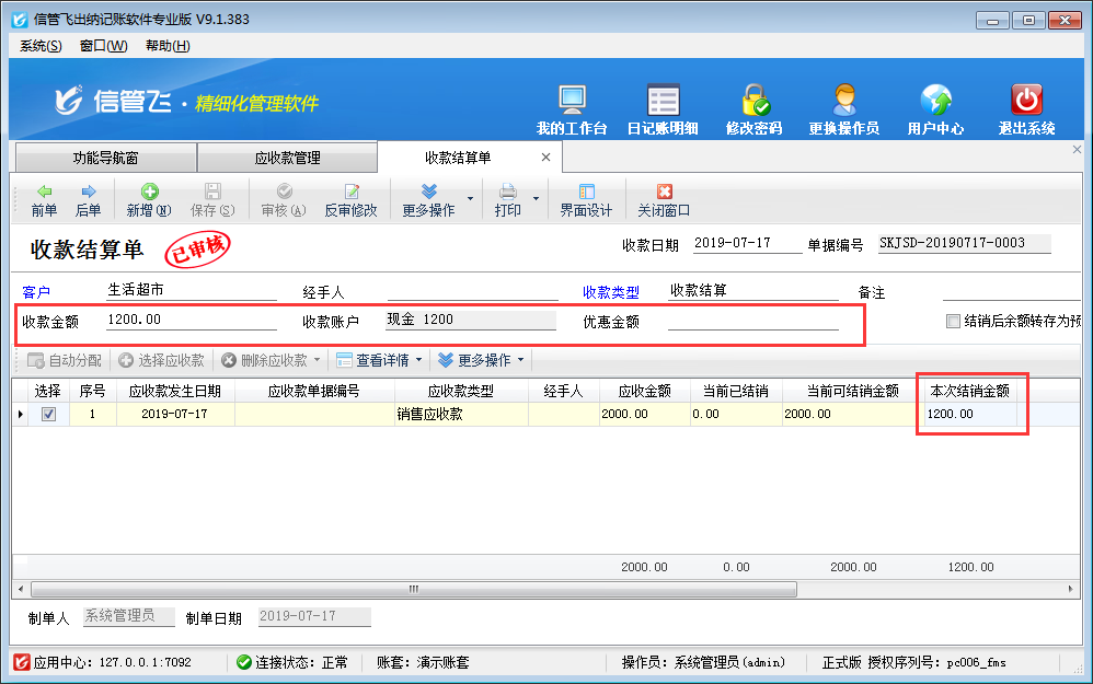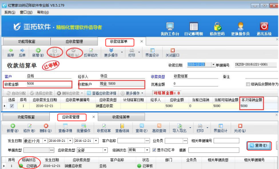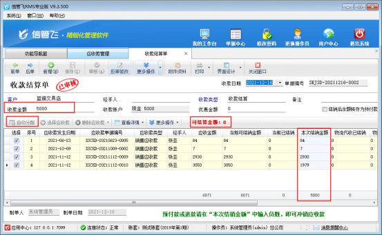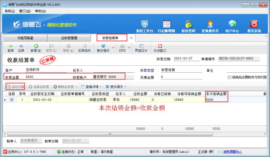 ????在收款結(jié)算單界面,默認是獲取此客戶所有未結(jié)銷的應(yīng)收款。收款金額輸入本次收款5000元,然后點擊“自動分配”,可把收款金額分配到本次結(jié)銷金額明細中。分配完成后點擊保存并審核結(jié)算單。則本次收款完成,如下圖所示: