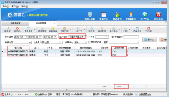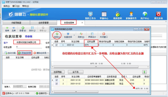 ????參數(shù)設(shè)置完成后,功能導(dǎo)航窗點擊“往來管理”—》“應(yīng)收款管理”可查看所有應(yīng)收款記錄。選擇示例客戶“中原科貿(mào)股份有限公司”匯總其應(yīng)收款,可看到有10月兩筆待結(jié)銷應(yīng)收款記錄。總金額為:8075元,如下圖所示: