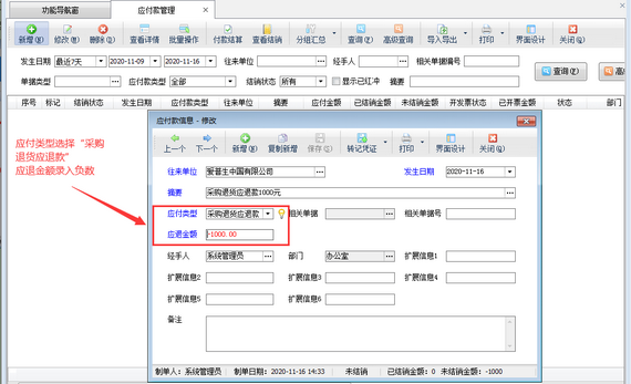 ????在功能導(dǎo)航窗點擊“往來管理”—》“應(yīng)付款管理”,即可打開應(yīng)付款管理界面,在工具欄點擊“新增”按鈕,系統(tǒng)打開新增應(yīng)付款窗口,如下圖所示,“應(yīng)付類型”選擇為“采購?fù)素洃?yīng)退款”,然后錄入應(yīng)退金額及其他數(shù)據(jù)后保存此應(yīng)付款信息即可。