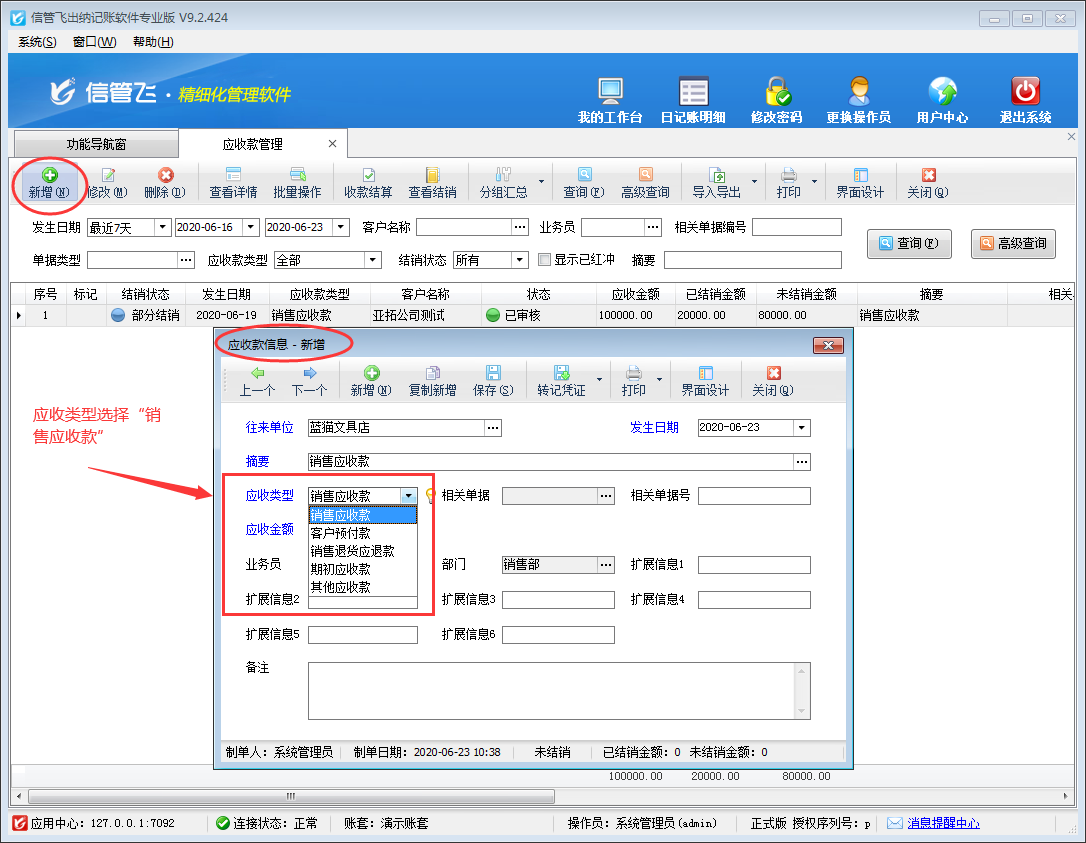 ????在功能導(dǎo)航窗點擊“往來管理”—》“應(yīng)收款管理”,即可打開應(yīng)收款管理界面,在工具欄點擊“新增”按鈕,系統(tǒng)打開新增應(yīng)收款窗口,如下圖所示,“應(yīng)收類型”選擇為“銷售應(yīng)收款”,然后錄入應(yīng)收金額及其他數(shù)據(jù)后保存此應(yīng)收款信息即可。