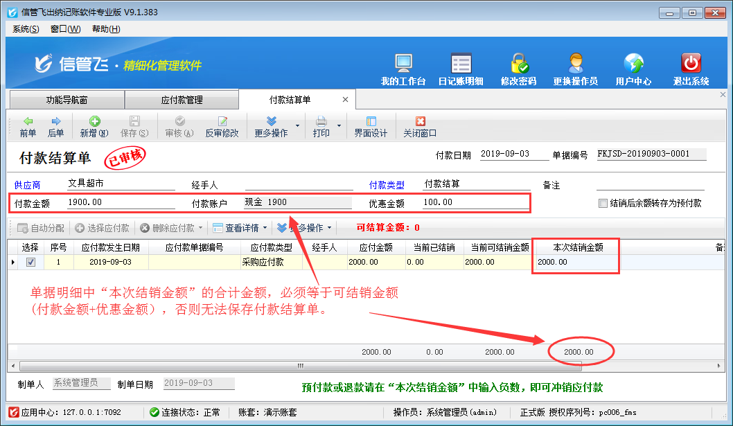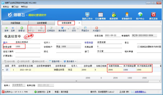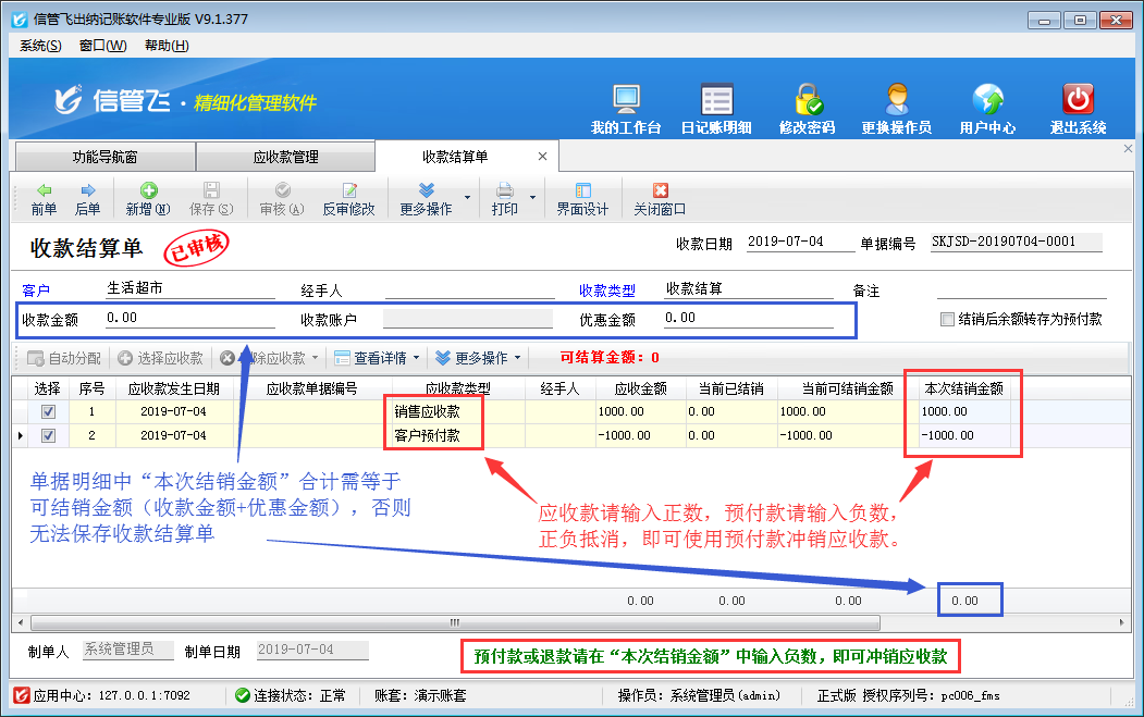 ????注意:收款結(jié)算單單據(jù)明細中“本次結(jié)銷金額”的合計金額,必須等于可結(jié)銷金額(收款金額 + 優(yōu)惠金額),否則無法保存收款結(jié)算單。