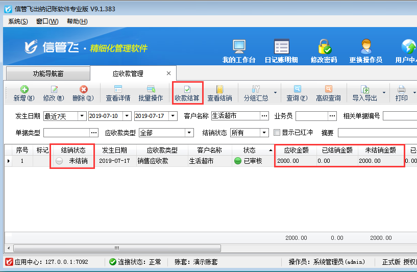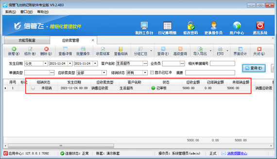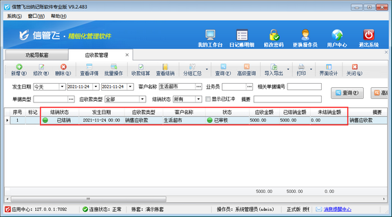 ????在功能導(dǎo)航窗點擊“往來管理”—》“應(yīng)收款管理”打開應(yīng)收款管理界面新增一條應(yīng)收款記錄,如下圖所示,客戶“生活超市”應(yīng)收金額為2000元,已結(jié)銷金額為0。
