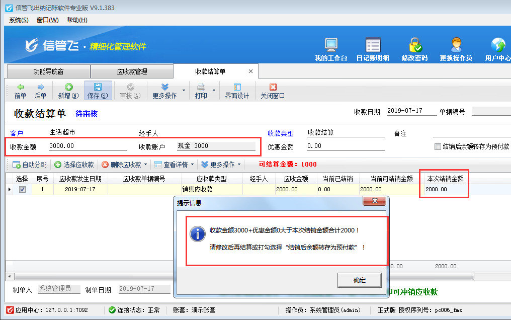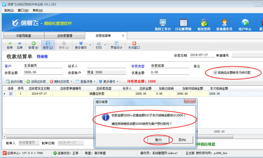 ????在應(yīng)收款管理界面點擊“收款結(jié)算”按鈕可以打開收款結(jié)算單對應(yīng)收款進行收款結(jié)算,單據(jù)主體“收款金額”錄入3000元,單據(jù)明細中“本次結(jié)銷金額”錄入2000元,保存收款結(jié)算單時系統(tǒng)提示“收款金額3000+優(yōu)惠金額0大于本次結(jié)銷金額合計2000!........”無法保存成功!
