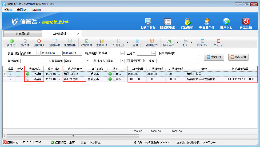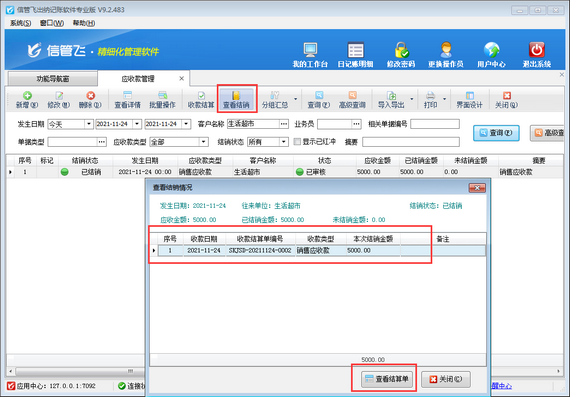 ????收款結(jié)算單單據(jù)審核之后,更新應(yīng)收款的結(jié)銷狀態(tài),在應(yīng)收款管理界面可以查看應(yīng)收款結(jié)銷情況,如下圖所示,客戶“生活超市”應(yīng)收金額2000元已結(jié)銷,未結(jié)銷金額為0。