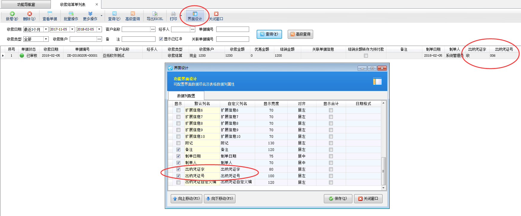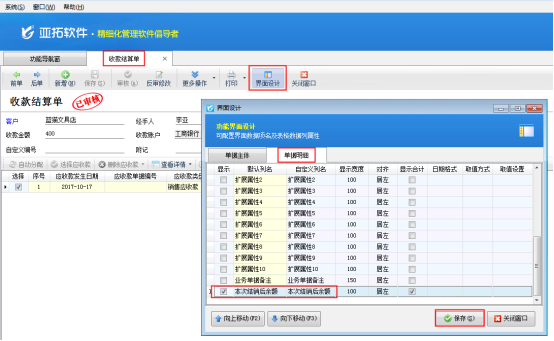 ????界面設(shè)計設(shè)置后,可以看到收款結(jié)算單界面的單據(jù)明細中已經(jīng)顯示了“本次結(jié)銷后余額”數(shù)據(jù)項,用戶可以看到該條應(yīng)收款的本次結(jié)銷后的余額。