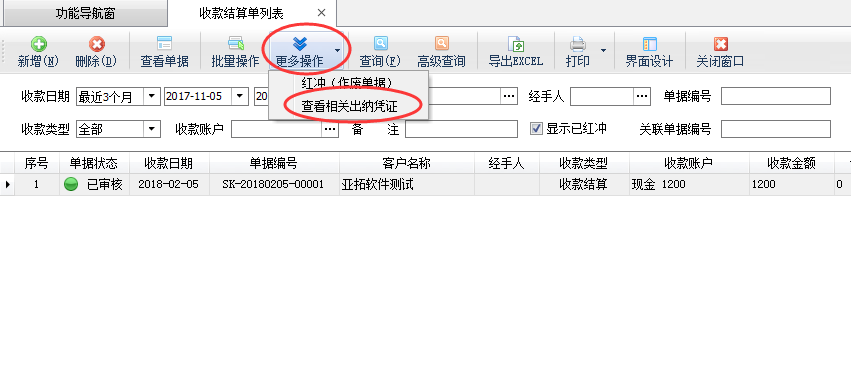 ????在功能導(dǎo)航窗點擊“往來管理”—》“收款結(jié)算單”即可打開收款結(jié)算單列表界面,然后通過工具欄內(nèi)“界面設(shè)計”功能可以將“出納憑證字”及“出納憑證號”數(shù)據(jù)項配置顯示出來,可以快速查看到收款結(jié)算單轉(zhuǎn)記的“出納憑證字”及“出納憑證號”,如下圖一所示。然后選中一個存在轉(zhuǎn)記出納憑證記錄的收款結(jié)算單,點擊工具欄中“更多操作”—》“查看相關(guān)出納憑證”按鈕(如圖二所示),即可快速打開相關(guān)出納憑證界面,查看相關(guān)出納憑證詳情(如下圖三所示)。