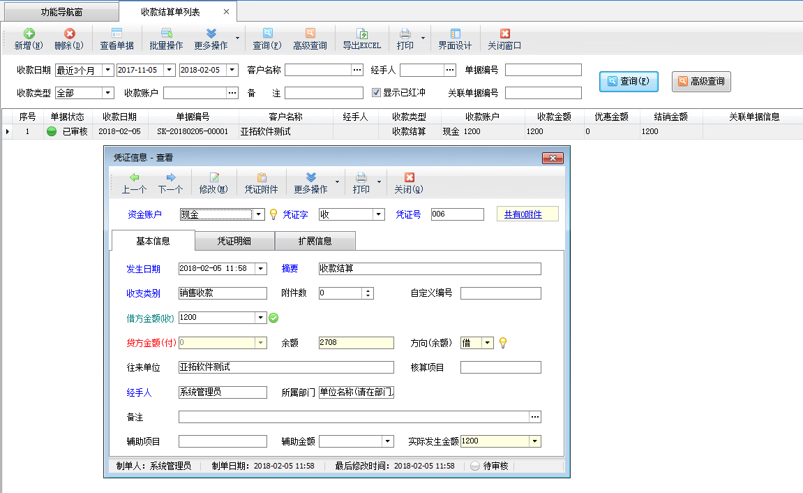 ????在功能導(dǎo)航窗點擊“往來管理”—》“應(yīng)收款管理”可以查看到當前未結(jié)銷的應(yīng)收款,選擇示例客戶“亞拓軟件測試”點擊工具欄的“收款結(jié)算”按鈕,會進入收款結(jié)算單界面,如下圖1所示:
