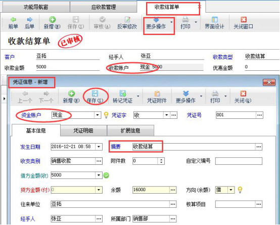 ????選擇示例客戶“亞拓軟件”,應(yīng)收款為15980元,本次收款5000元,選擇應(yīng)收款單據(jù)點擊“收款結(jié)算”,彈出的收款結(jié)算單界面,收款金額輸入5000,點擊“自動分配”分配到本次結(jié)銷金額中(如沒有默認資金賬戶,選擇收款賬戶輸入收款金額),然后保存并審核收款結(jié)算單,則表示此筆應(yīng)收款結(jié)銷5000元,如下圖所示: