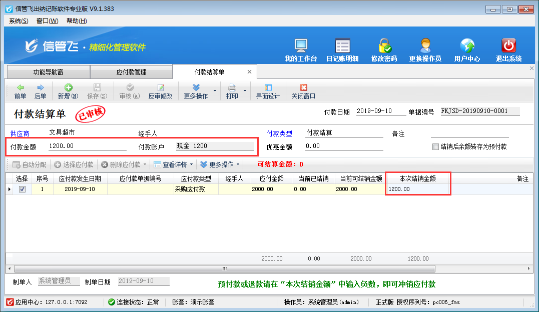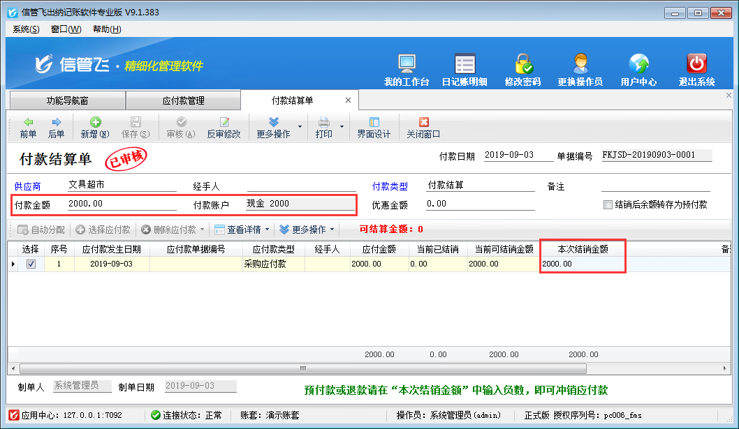 ????點擊“付款結(jié)算”按鈕,可以打開付款結(jié)算單界面。在付款結(jié)算單界面。如下圖所示,在付款結(jié)算單單據(jù)主體選擇付款賬戶后輸入“付款金額”3600,單據(jù)明細中的“本次結(jié)銷金額”輸入3600,保存并審核付款結(jié)算單即可。