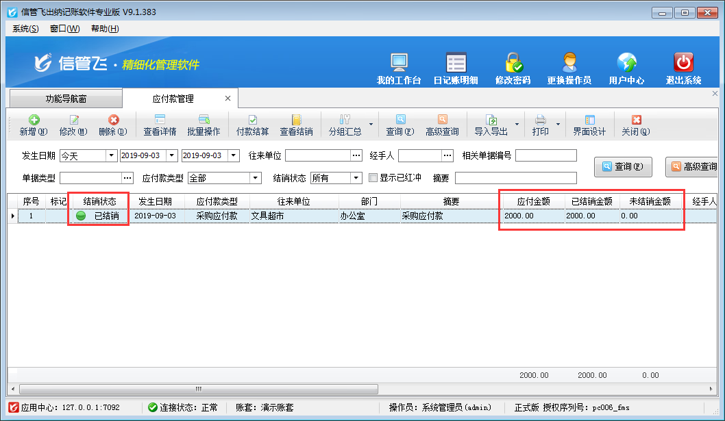 ????保存審核此付款結(jié)算單后,返回至應(yīng)付款管理界面,點擊“查詢”刷新,可以看到結(jié)銷狀態(tài)由“未結(jié)銷”變?yōu)椤耙呀Y(jié)銷”。