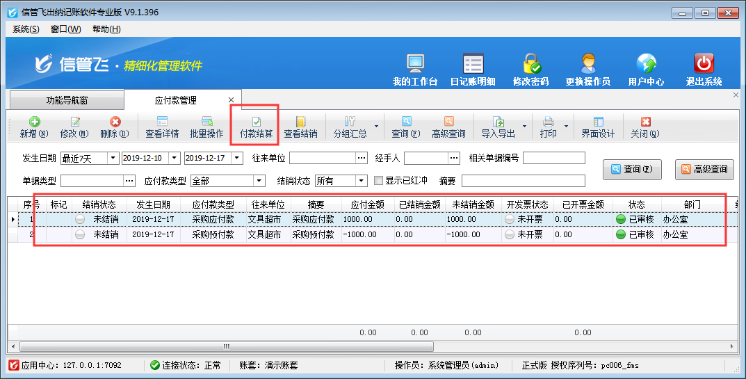 ????信管飛RMS軟件的應(yīng)付款記錄是根據(jù)開的采購入庫單保存審核后自動生成的,是一一對應(yīng)的。在功能導(dǎo)航窗點擊“往來管理”—》“應(yīng)付款管理”可查看單據(jù)生成的應(yīng)付款記錄,選擇一條未結(jié)銷的應(yīng)付款,點擊工具欄的“付款結(jié)算”,進行付款結(jié)算操作,如下圖所示: