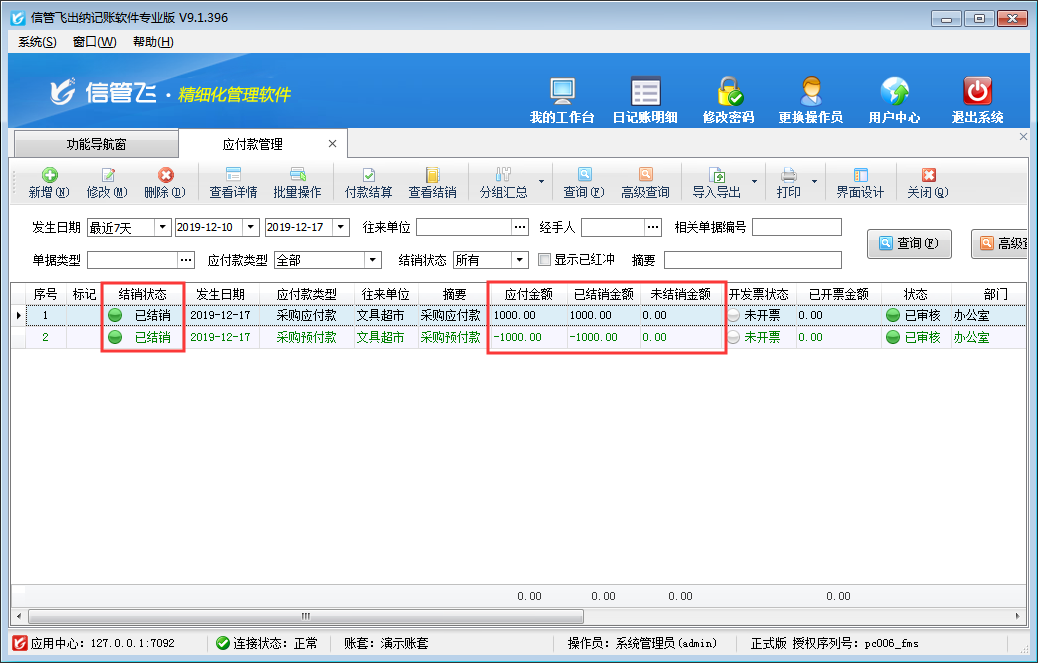 ????付款結(jié)算單單據(jù)審核之后,更新應(yīng)付款的結(jié)銷狀態(tài),在應(yīng)付款管理界面可以查看應(yīng)付款結(jié)銷情況,會由“未結(jié)銷”變?yōu)椤耙呀Y(jié)銷”如下圖所示: