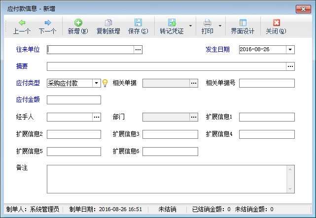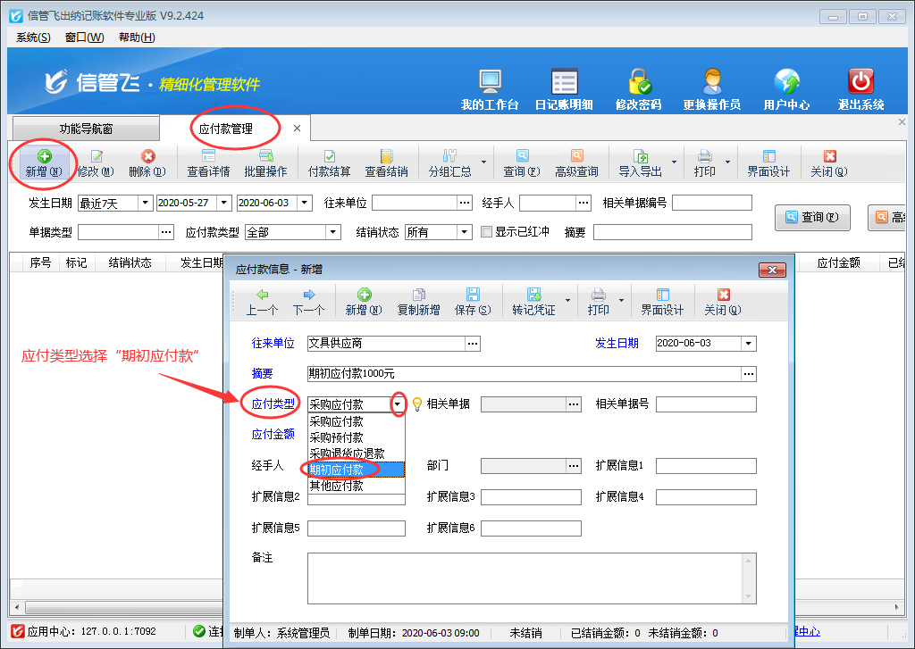 ????在功能導(dǎo)航窗點擊“往來管理”—》“應(yīng)付款管理”,即可打開應(yīng)付款管理界面,在工具欄點擊“新增”按鈕,系統(tǒng)打開新增應(yīng)付款窗口,如下圖所示,“應(yīng)付類型”選擇為“期初應(yīng)付款”,然后錄入應(yīng)付金額及其他數(shù)據(jù)后保存此應(yīng)付款信息即可。