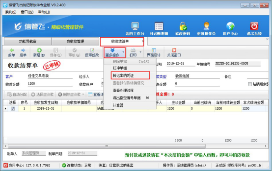 ????然后在收款結(jié)算單界面點擊“更多操作”—》“紅沖單據(jù)”,如下圖所示,單據(jù)紅沖后,點擊“更多操作”—》“刪除按鈕”,即可刪除收款結(jié)算單。