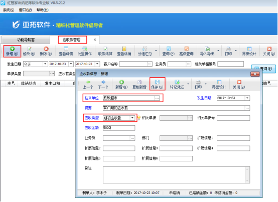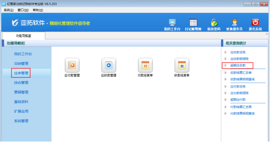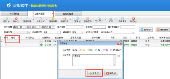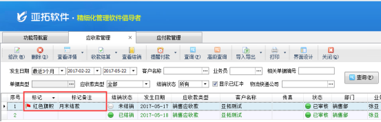 ????亞拓管理軟件和紅管家倉庫管理軟件都可以對應(yīng)收款管理、應(yīng)付款管理進行標記備注。送貨單軟件的應(yīng)收款管理中也可以對應(yīng)收款進行標記備注。下面我們以亞拓管理軟件專業(yè)版為例,介紹對應(yīng)收款管理標記備注的操作步驟(應(yīng)付款和應(yīng)收款操作一致)。