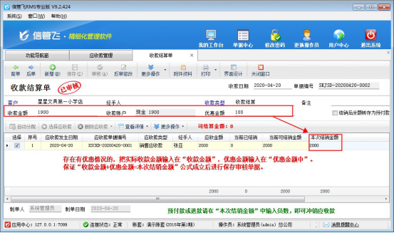 ????如果需要給客戶優(yōu)惠或抹零,可以錄入優(yōu)惠金額,如應(yīng)收2000元,實際收款1900元,優(yōu)惠了100元,請在收款結(jié)算單單據(jù)主體“收款金額”中錄入1900元,“優(yōu)惠金額”內(nèi)錄入100元,單據(jù)明細中“本次結(jié)銷金額”錄入2000元,保存并審核收款結(jié)算單即可,如下圖所示。