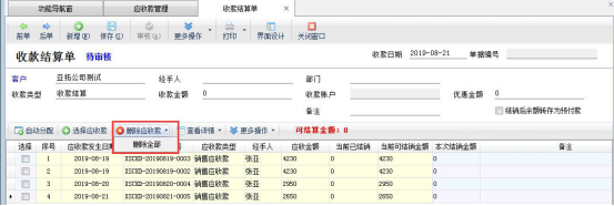 ????彈出“收款結(jié)算單”界面,默認是顯示所有的未結(jié)銷的應(yīng)收款,如需要只結(jié)銷部分應(yīng)收款(示例結(jié)銷2019-8-19的應(yīng)收款),有以下兩種方法: