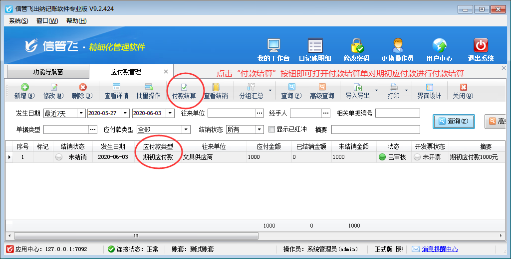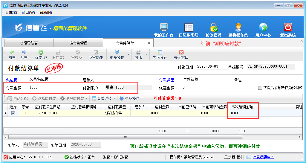????保存后,應(yīng)付款管理界面增加一條未結(jié)銷的期初應(yīng)付款記錄,后續(xù)給供應(yīng)商結(jié)款后,可以在軟件中結(jié)銷此期初應(yīng)付款,選擇此條期初應(yīng)付款記錄,然后在工具欄點擊“付款結(jié)算”按鈕即可打開付款結(jié)算單界面對期初應(yīng)付款進行付款結(jié)銷,如下圖所示: