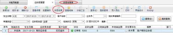 ????在功能導(dǎo)航窗點擊“往來管理”—》“應(yīng)收款管理”進入應(yīng)收款管理界面,在應(yīng)收款管理界面選擇未結(jié)銷的應(yīng)收款,點擊工具欄的“收款結(jié)算”進行收款操作,如下圖所示: