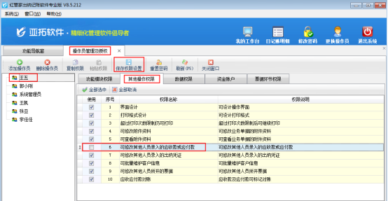 ????在功能導(dǎo)航窗點“系統(tǒng)管理”→“操作員及授權(quán)”即可進入“操作員管理及授權(quán)”界面,選中操作員賬號,在“其他操作權(quán)限”界面將“可修改其他人員錄入的應(yīng)收款或應(yīng)付款”權(quán)限打鉤取消,如下圖1所示,設(shè)置操作員賬號“王五”不可修改其他人員錄入的應(yīng)收款或應(yīng)付款。