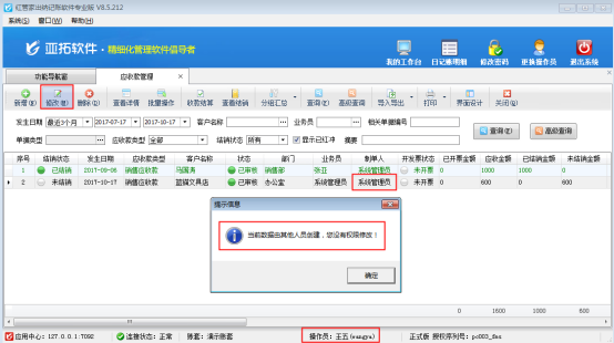 ????設(shè)置完成之后,我們使用操作員“王五”登錄軟件并修改其他人員所錄入的應(yīng)收款信息時,可以看到系統(tǒng)會彈出提示信息“當前數(shù)據(jù)由其他人員創(chuàng)建,您沒有權(quán)限修改!”,如下圖2所示。