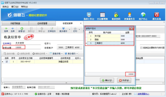 ????信管飛出納記賬軟件、信管飛RMS軟件等都支持管理往來賬,對應(yīng)收應(yīng)付款支持結(jié)算操作,有時存在一筆應(yīng)收款多個資金賬戶結(jié)算的情況,針對此種情況,以“信管飛出納記賬軟件”為例,如何多賬戶結(jié)算?