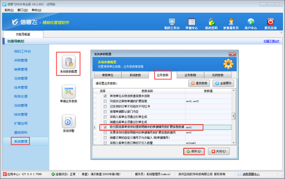 ????在功能導(dǎo)航窗選擇“系統(tǒng)管理”—》“系統(tǒng)參數(shù)配置”—》“業(yè)務(wù)參數(shù)”,進入業(yè)務(wù)參數(shù)設(shè)置界面,在“業(yè)務(wù)單據(jù)相關(guān)參數(shù)”中勾選“收付款結(jié)算單保存時提取明細中的單據(jù)編號到擴展信息數(shù)據(jù)項”參數(shù),并設(shè)置參數(shù)值,默認為ext1(擴展信息1),然后保存參數(shù)配置,如下圖所示。