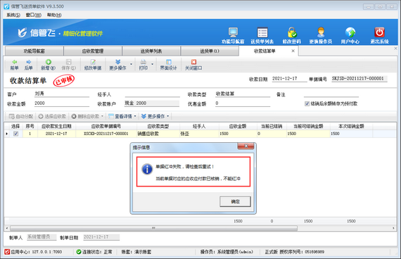 ????應(yīng)收、應(yīng)付賬款管理是現(xiàn)代企業(yè)資金管理的重要組成部分,其管理效果的好壞直接影響到企業(yè)經(jīng)營的成敗,信管飛RMS、信管飛出納記賬軟件及信管飛送貨單軟件均支持管理往來賬款,如果應(yīng)收款結(jié)銷后發(fā)現(xiàn)收款結(jié)銷錯誤,系統(tǒng)支持紅沖并刪除收款記錄,部分用戶在紅沖收款結(jié)算單時會出現(xiàn)如下圖提示:收款結(jié)算單紅沖失敗,當前單據(jù)對應(yīng)的應(yīng)收應(yīng)付款已結(jié)銷,不能紅沖!