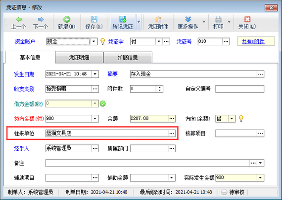 ????在功能導航窗點擊“出納管理”—》“現金日記賬”,新增日記賬憑證時選擇一下往來單位信息,如下圖所示。