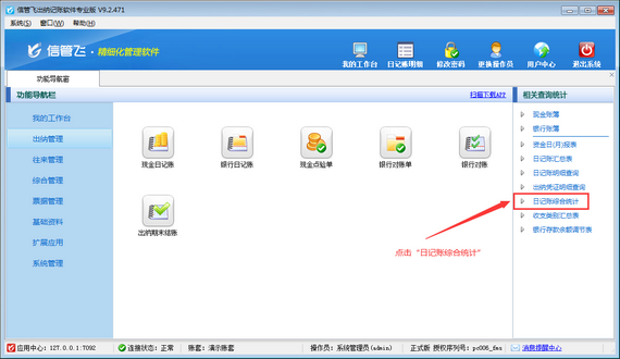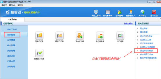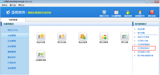 ????然后在“出納管理”模塊最右側的“相關查詢統計”內點擊“日記賬綜合統計”,打開“日記賬綜合統計”界面,如下圖所示。
