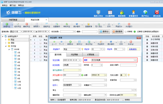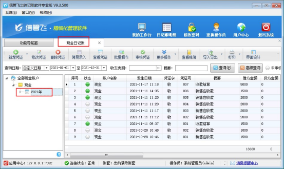 ????信管飛出納記賬軟件、信管飛RMS標準版和專業版在新增出納憑證時都支持錄入憑證明細,方便用戶錄入每個憑證的明細內容(系統默認沒有啟用憑證明細功能,啟用方法請參考:出納憑證如何啟用憑證明細功能?),軟件支持對憑證明細進行查詢統計,本篇文章以信管飛RMS專業版為例詳細介紹一下如何查詢出納憑證明細。