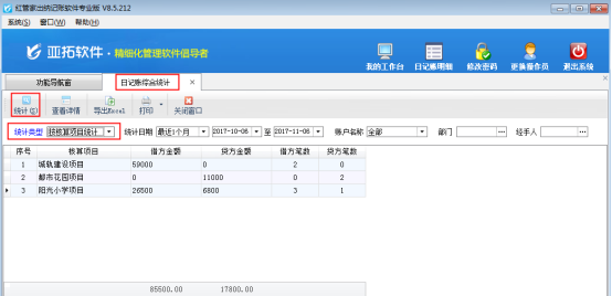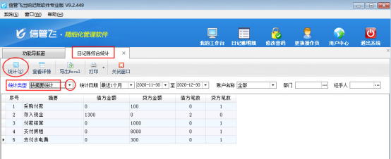 ????在“日記賬綜合統計”界面,統計類型選擇“按摘要統計”,然后點擊“統計”按鈕,可以根據摘要進行統計。另外,系統支持根據日期、賬戶名稱、部門、經手人等條件進行統計查詢。