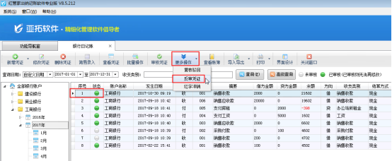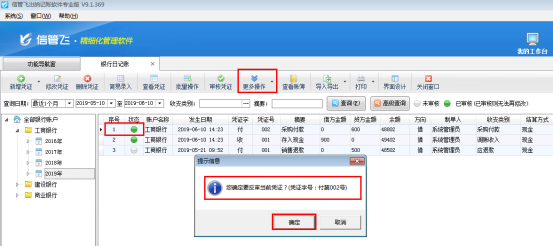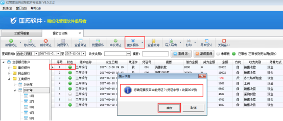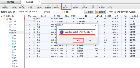 ????在銀行日記賬列表界面,如圖2所示,點擊“更多操作”——》“反審憑證”,系統彈出提示信息“您確定要反審當前憑證?”,點擊“確定”按鈕,如圖3所示。