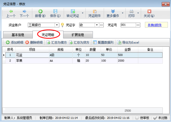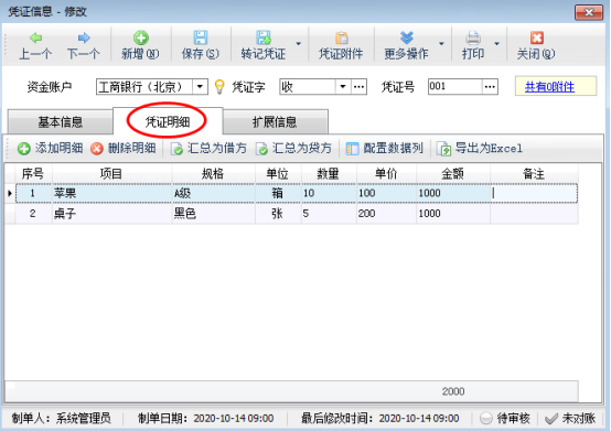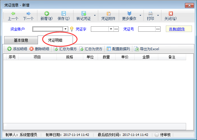 ????在功能導航窗點“出納管理”—》“銀行日記賬”,新增憑證界面點擊“憑證明細”,可以添加憑證明細內容,如圖1所示: