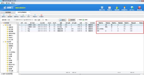 ????在功能導航窗點“出納管理”—》“出納憑證明細查詢”,進入出納憑證明細查詢界面,可以看到錄入的出納憑證的明細內容,如圖2、圖3所示: