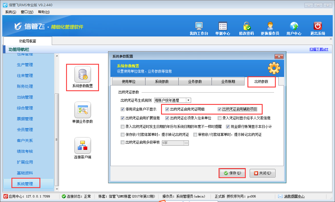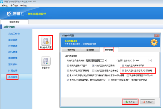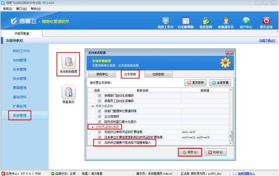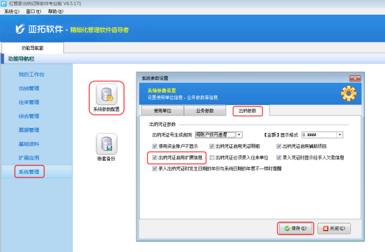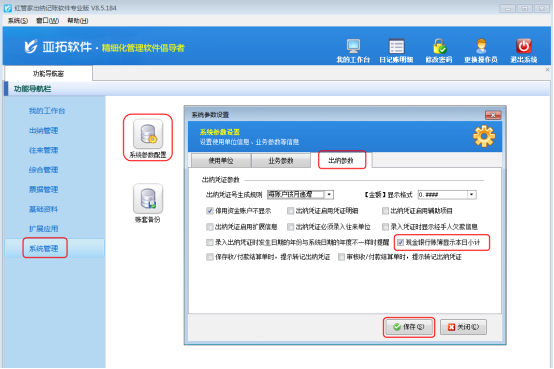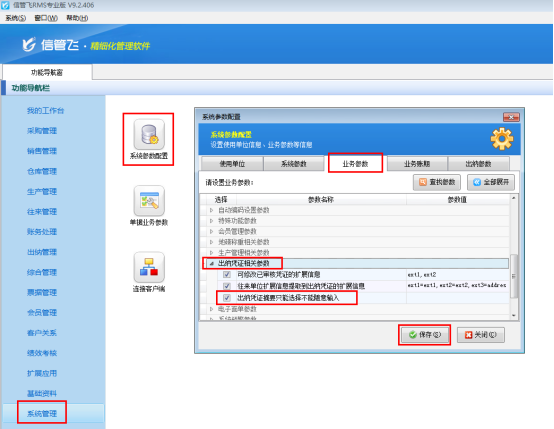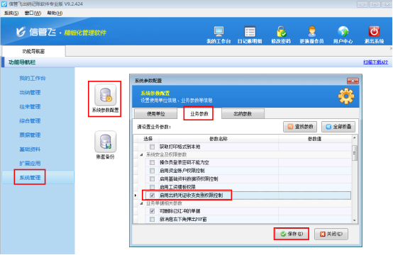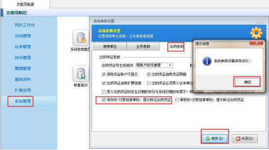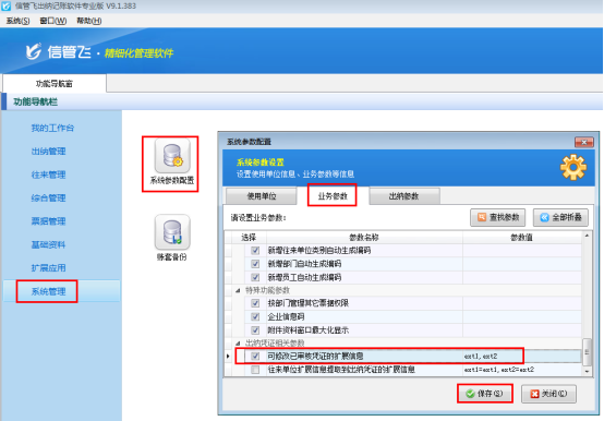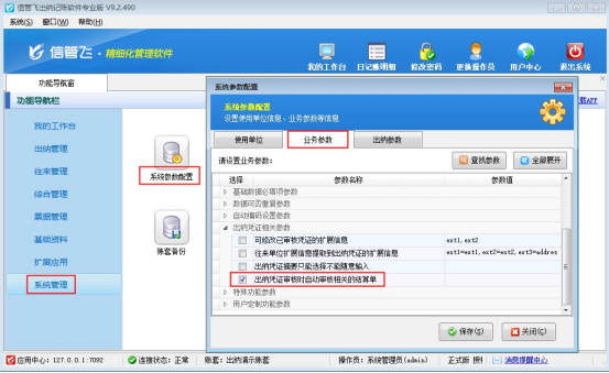 ????在“功能導航窗”點擊“系統管理”—》“系統參數配置”,啟用“業務參數”中的“出納憑證審核時自動審核相關的結算單”參數,如下圖所示: