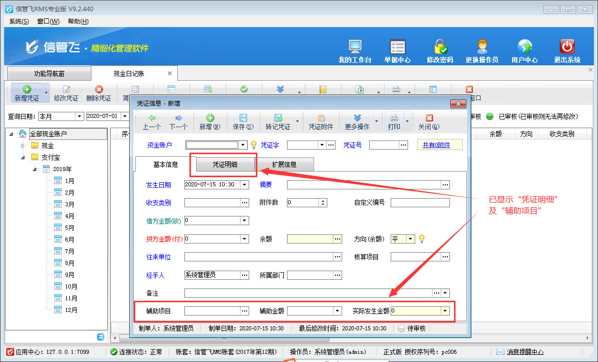 ????信管飛出納記賬軟件、信管飛RMS(標準版、專業版)中的出納管理模塊,在新增憑證中有的需要填寫輔助項目和憑證明細,軟件支持設置在新增憑證時顯示這些項目。下邊以信管飛RMS為例,演示一下如何設置出納憑證啟用憑證明細和輔助項目。
