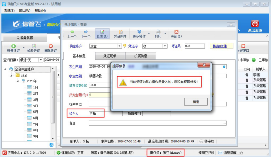 ????設置操作員權限之后,操作員“張亞”登錄軟件,在功能導航窗點擊“出納管理”—》“現金日記賬”,進入現金日記賬界面,選擇一個制單人為其他人員的日記賬憑證,然后點擊“修改憑證”按鈕,系統提示“當前憑證為其他操作員錄入的,您沒有權限修改!”,如圖所示。操作員“張亞”可以查看其他操作員所開的憑證信息,但在查看窗口同樣無法修改憑證信息,如圖所示:
