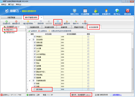 # 6.4.8 出納記賬軟件如何設置操作員的收支類別權限?