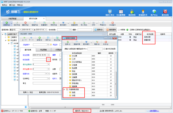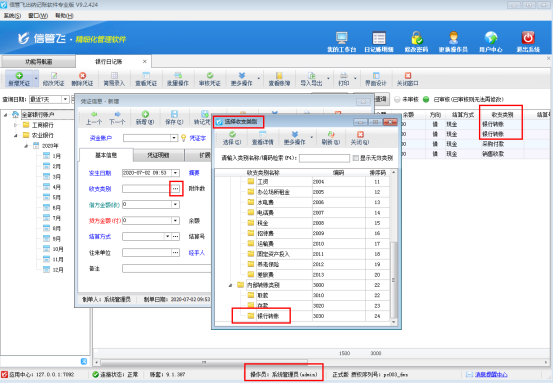 ????系統管理員登錄軟件后可以看到“銀行轉賬”相關的出納憑證,如圖3所示。而使用操作員“張亞”登錄軟件,日記賬列表內看不到收支類別為“銀行轉賬”的憑證記錄,新增憑證界面在選擇收支類別窗口也無法選擇到“銀行轉賬”,如下圖4所示: