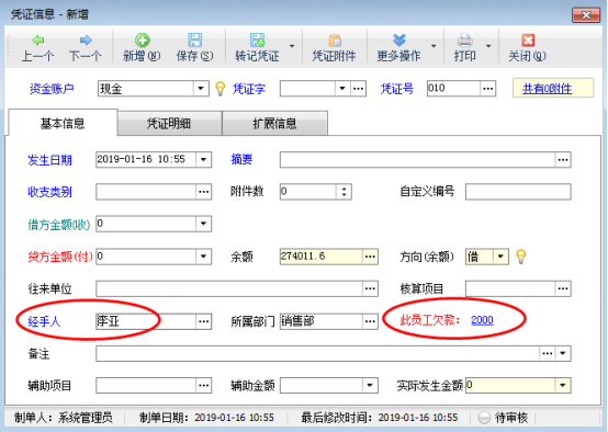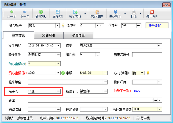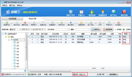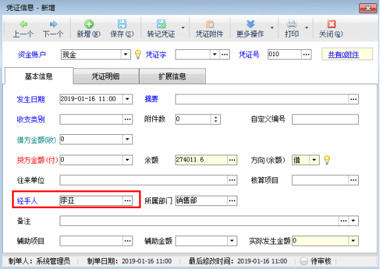 ????在功能導航窗點擊“出納管理”—》“現金日記賬”,新增日記賬憑證時選擇一下經手人信息,如下圖所示。