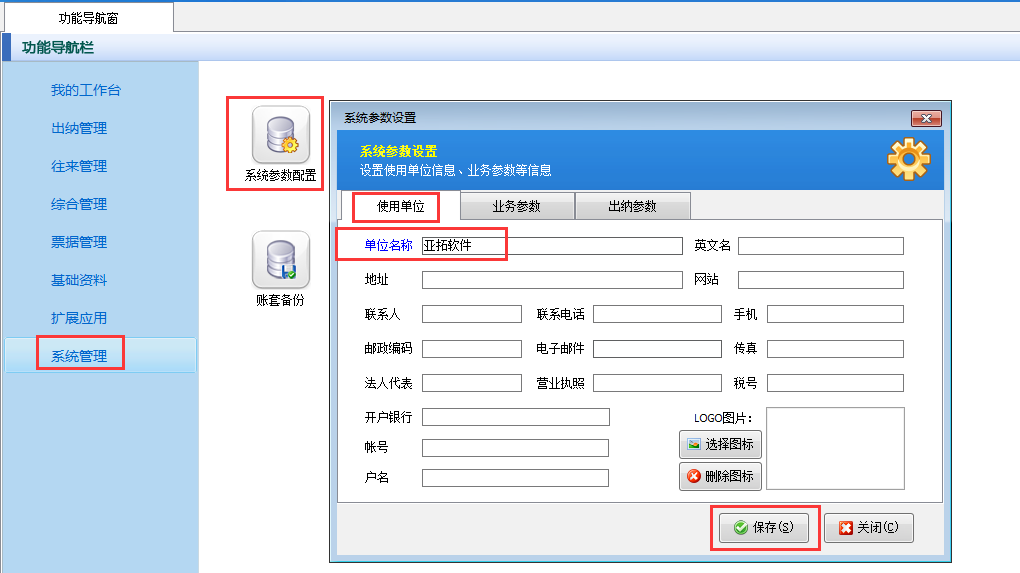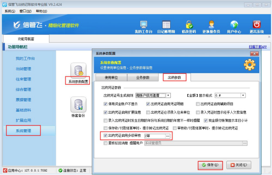 ????在功能導航窗點擊“系統管理”—》“系統參數配置”—》“出納參數”即可打開“出納參數”設置界面,打鉤啟用“出納憑證必須錄入往來單位”參數,然后保存配置,如下圖一所示。