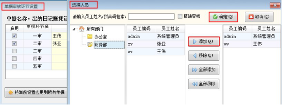 ????在功能導航窗,點擊“系統管理”—》“系統參數配置”—》“出納參數”中勾選啟用“出納憑證啟用多級審核”,點擊右邊文本框的“...”處,進入單據審核環節設置,如下圖所示,對出納日記賬憑證進行了二級審核的設置,一審操作員是“王偉”,二審操作員是“張亞”。