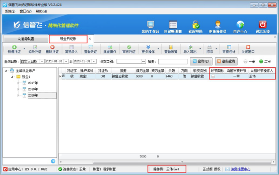 ????操作員“王偉”登錄軟件,新增一個現金日記賬,審核日記賬后,在日記賬列表界面,在界面設計中勾選顯示出“當前審核環節”,可看到顯示為一審。如下圖所示:
