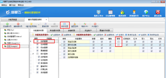 ????在功能導航窗選擇“系統管理”—》“操作員及授權”—》選擇操作員“王五”,在功能模塊權限中選擇“出納管理”,右側權限設置把現金日記賬和銀行日記賬的可審核權限的勾選符號取消,然后點擊“保存設置”按鈕進行保存權限,如下圖1所示: