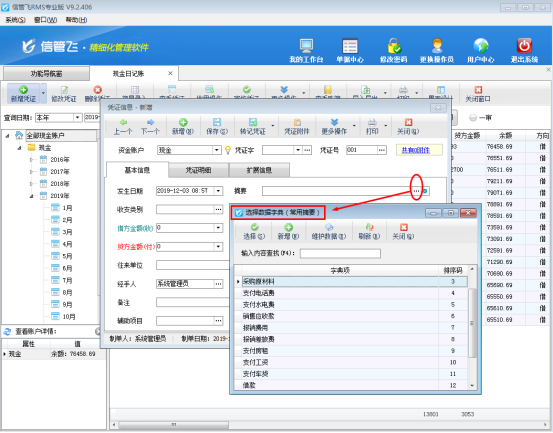 ????信管飛RMS標準版和專業版都包括出納模塊,可以登記出納日記賬憑證,出納憑證摘要默認可以手動隨意輸入。有些客戶對出納憑證摘要需要進行規范管理,登記憑證時摘要只能選擇不能隨意輸入該如何設置呢?本篇文章以信管飛RMS專業版為例介紹一下如何設置出納憑證摘要只能選擇不能隨意輸入。