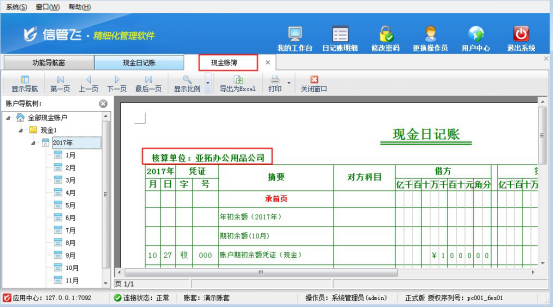 ????出納記賬軟件下載安裝完成后,使用演示賬套中的資金賬戶登記現金日記賬,在現金日記賬界面,點擊“查看賬簿”,可進入現金賬簿界面,如下圖1所示,可看到核算單位顯示:亞拓辦公用品公司,如果需要修改為自己公司信息,該如何修改?本文以“信管飛出納記賬軟件”為例,示范如何修改現金賬簿中的核算單位。