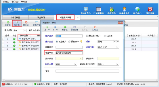 ????現金賬簿中的核算單位默認是調用資金賬戶提前維護好的核算單位信息,因此需要修改此內容,需要到資金賬戶中找到當前現金賬戶進行修改,在功能導航窗選擇“基礎資料”—》“資金賬戶”,找到現金賬戶“現金1”,點擊修改按鈕,可修改核算單位信息。如下圖2所示: