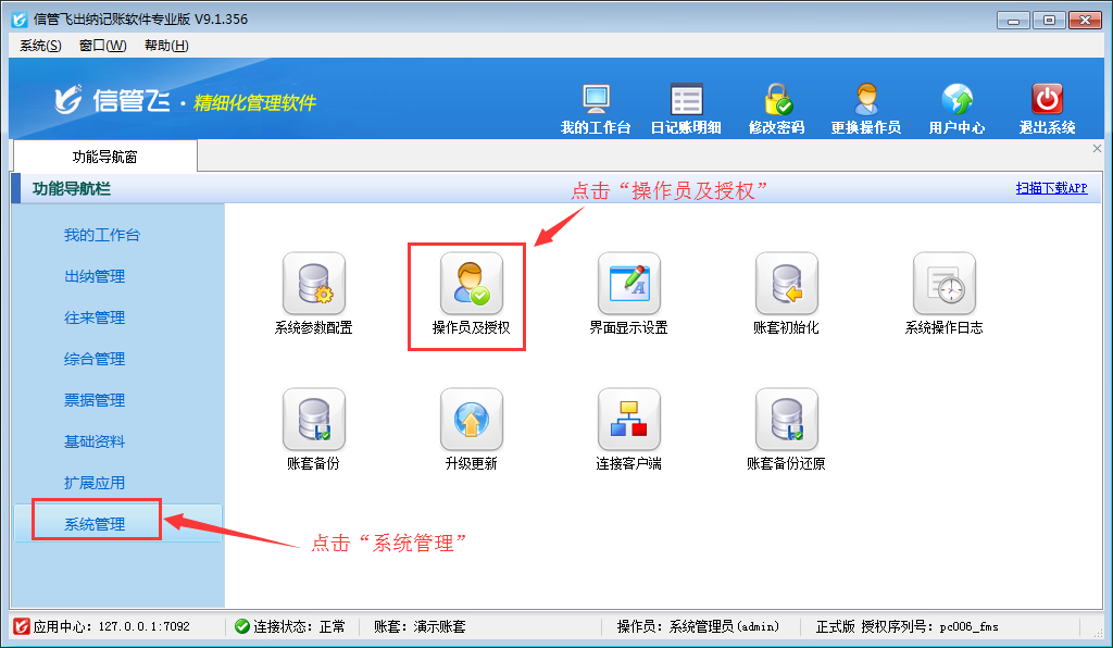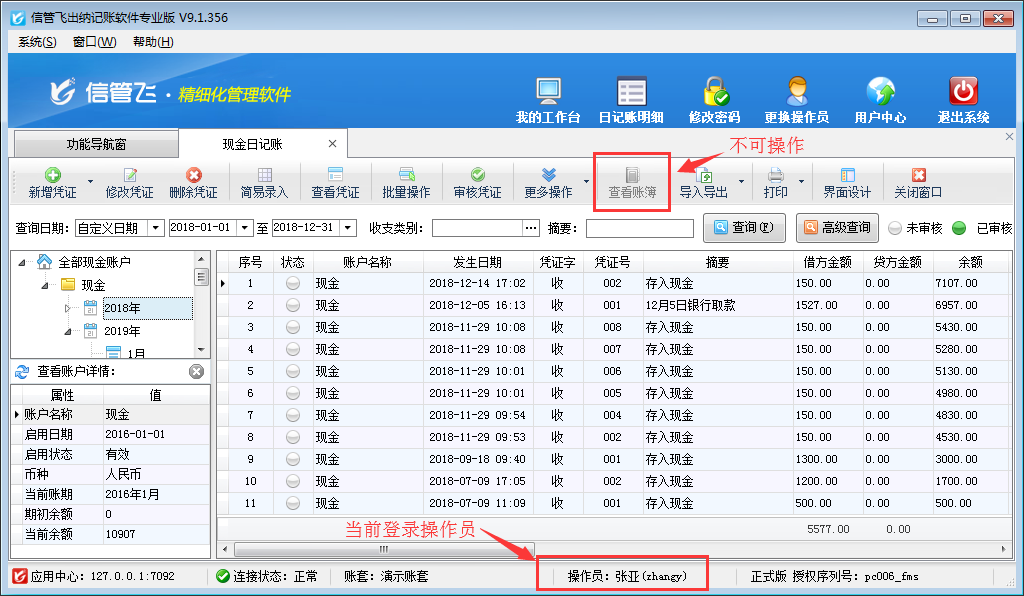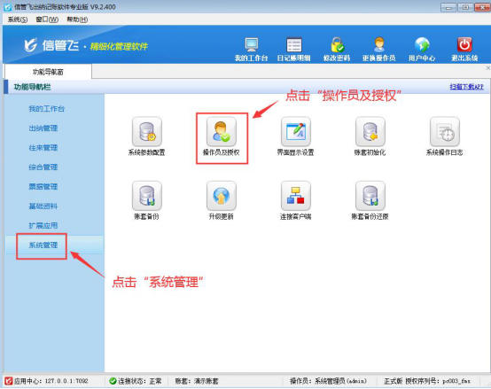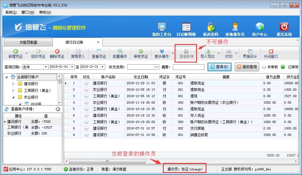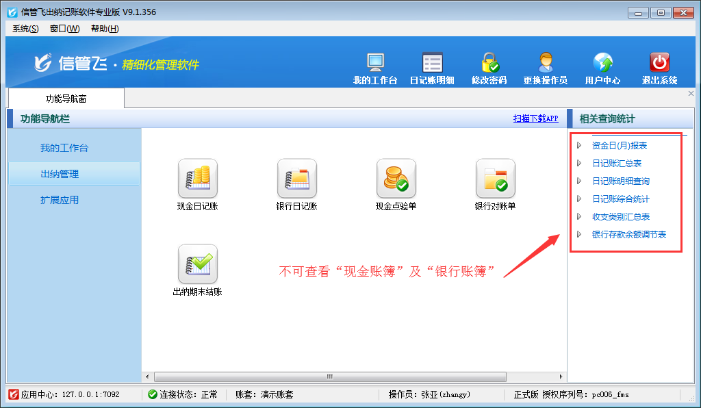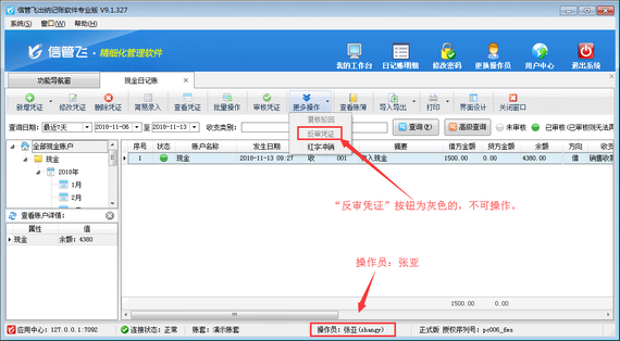 ????信管飛出納記賬軟件、信管飛RMS(標準版、專業版)都有出納模塊,可以管理現金日記賬和銀行日記賬。許多用戶在出納管理有審核出納憑證人員,軟件支持設置操作員的日記賬憑證的審核權限。以信管飛出納記賬軟件專業版本為例,介紹一下如何設置操作員不可審核現金日記賬、銀行日記賬的方法。