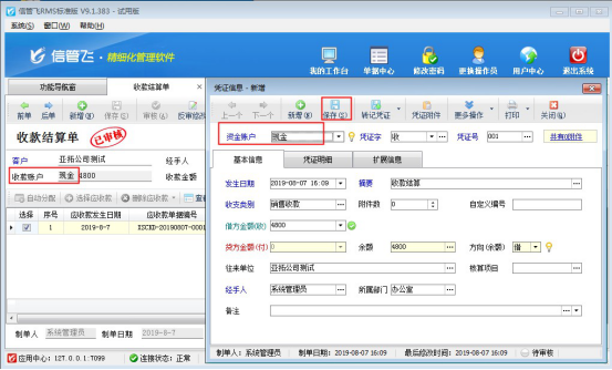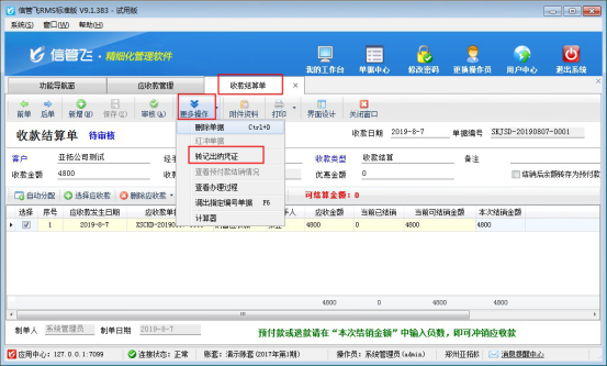 ????信管飛RMS標準版和專業版中增加了出納模塊,可以登記現金銀行日記賬。信管飛RMS 軟件中用戶在做收款結算后如需要把這筆賬管理到日記賬中,可以在收款時轉記到出納日記賬中。在軟件中如何操作呢?
